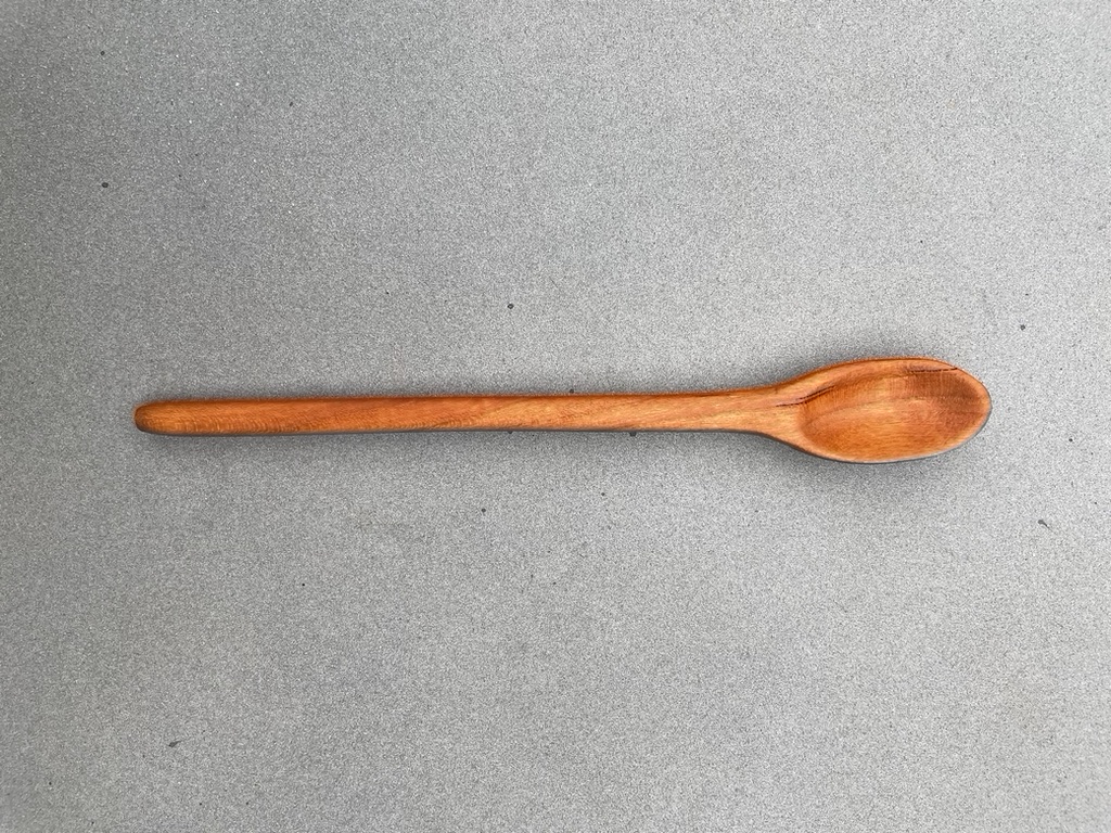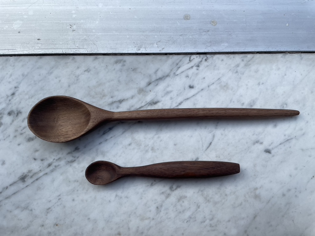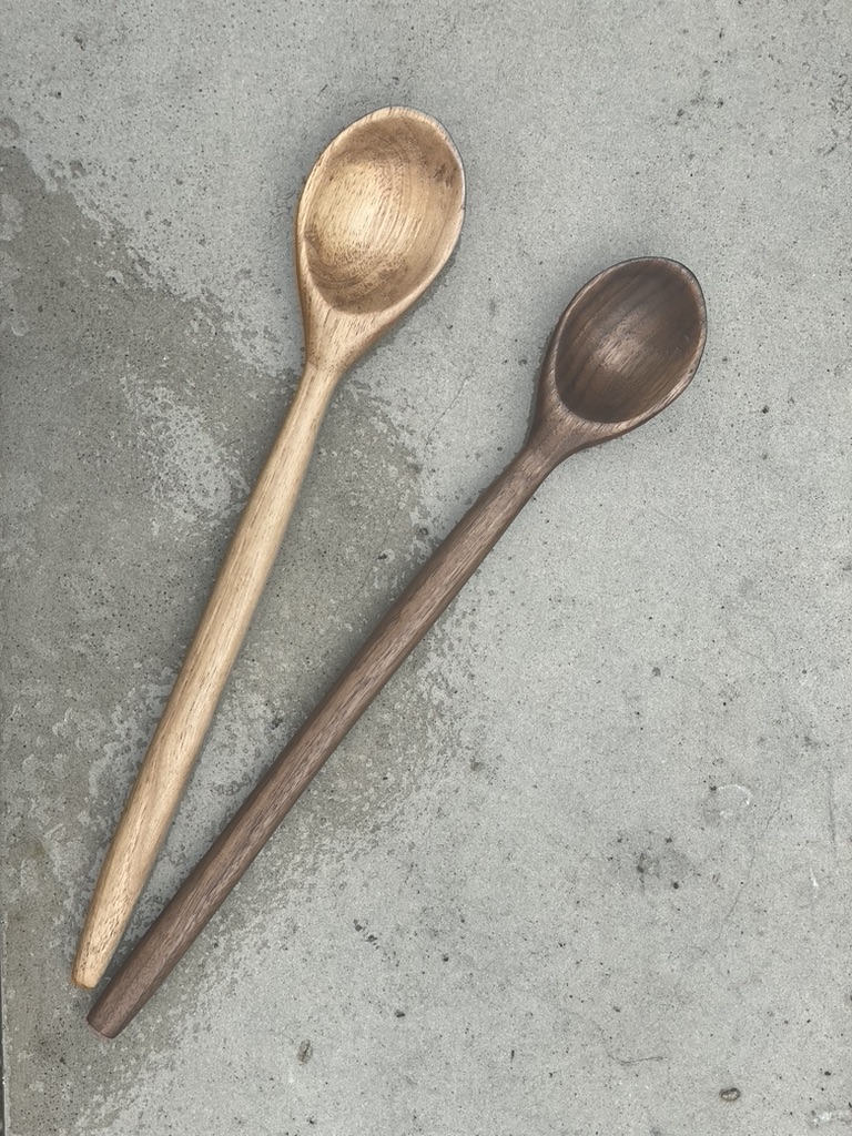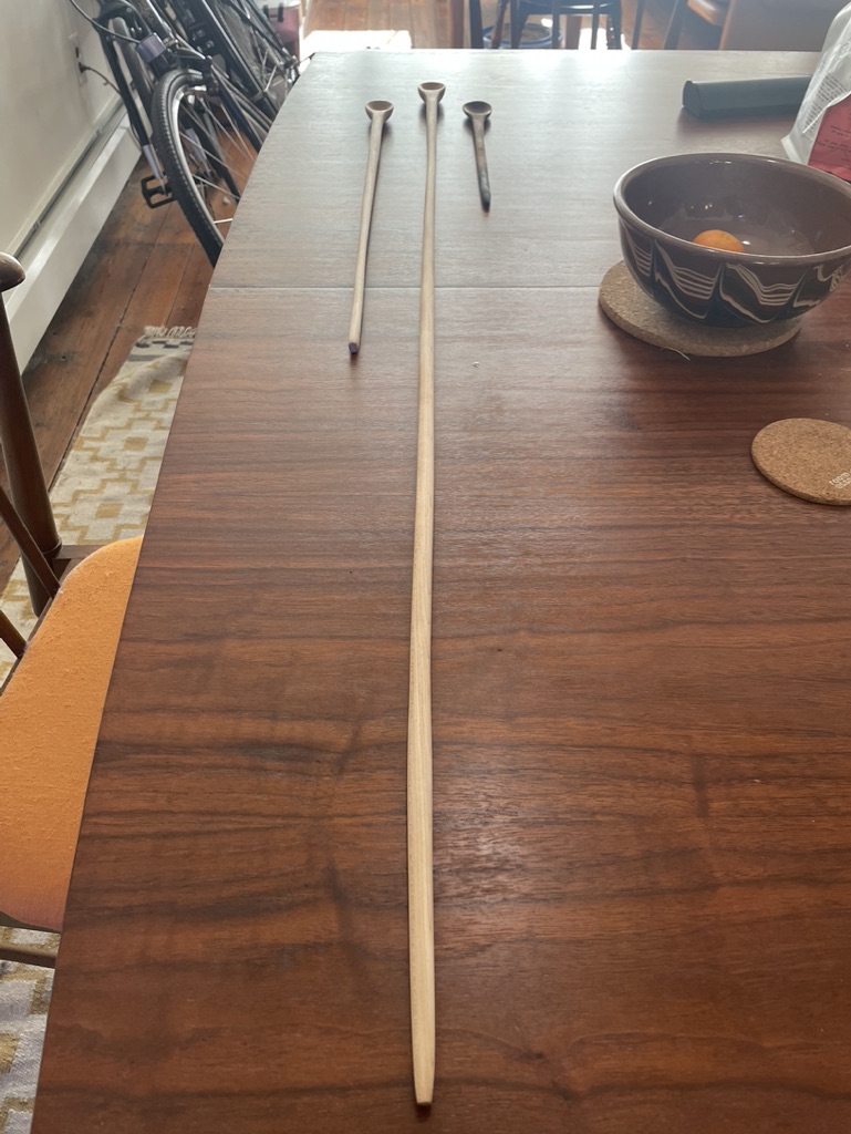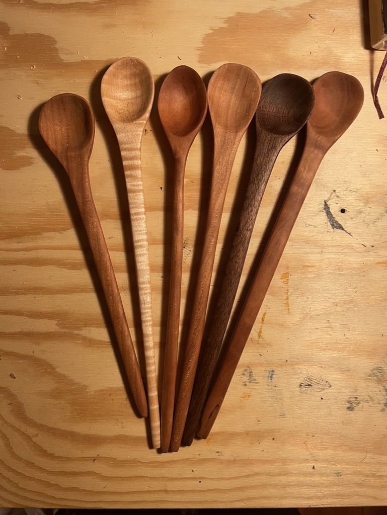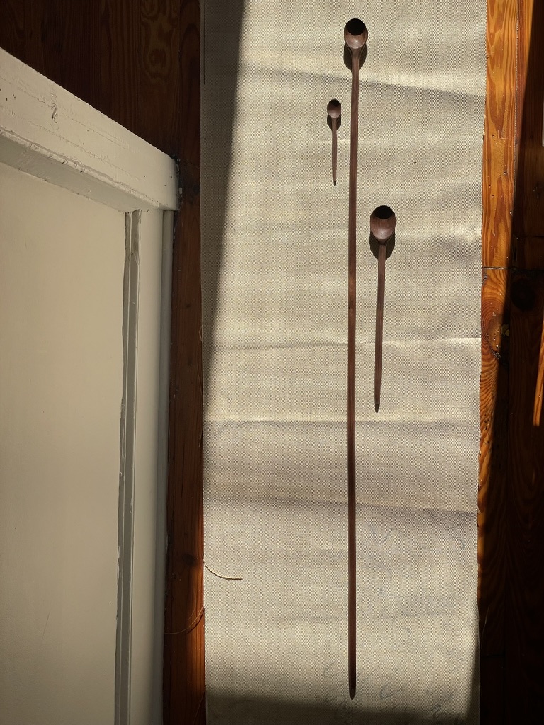 I had been making a bunch of this particular spoon design that had a fairly small bowl but a nice long handle, perfect getting into the corners of deep pots. I started to think, how long can I make a spoon where it stops being a functional spoon? I made a series of these longs spoons, each was around ~4ft long.